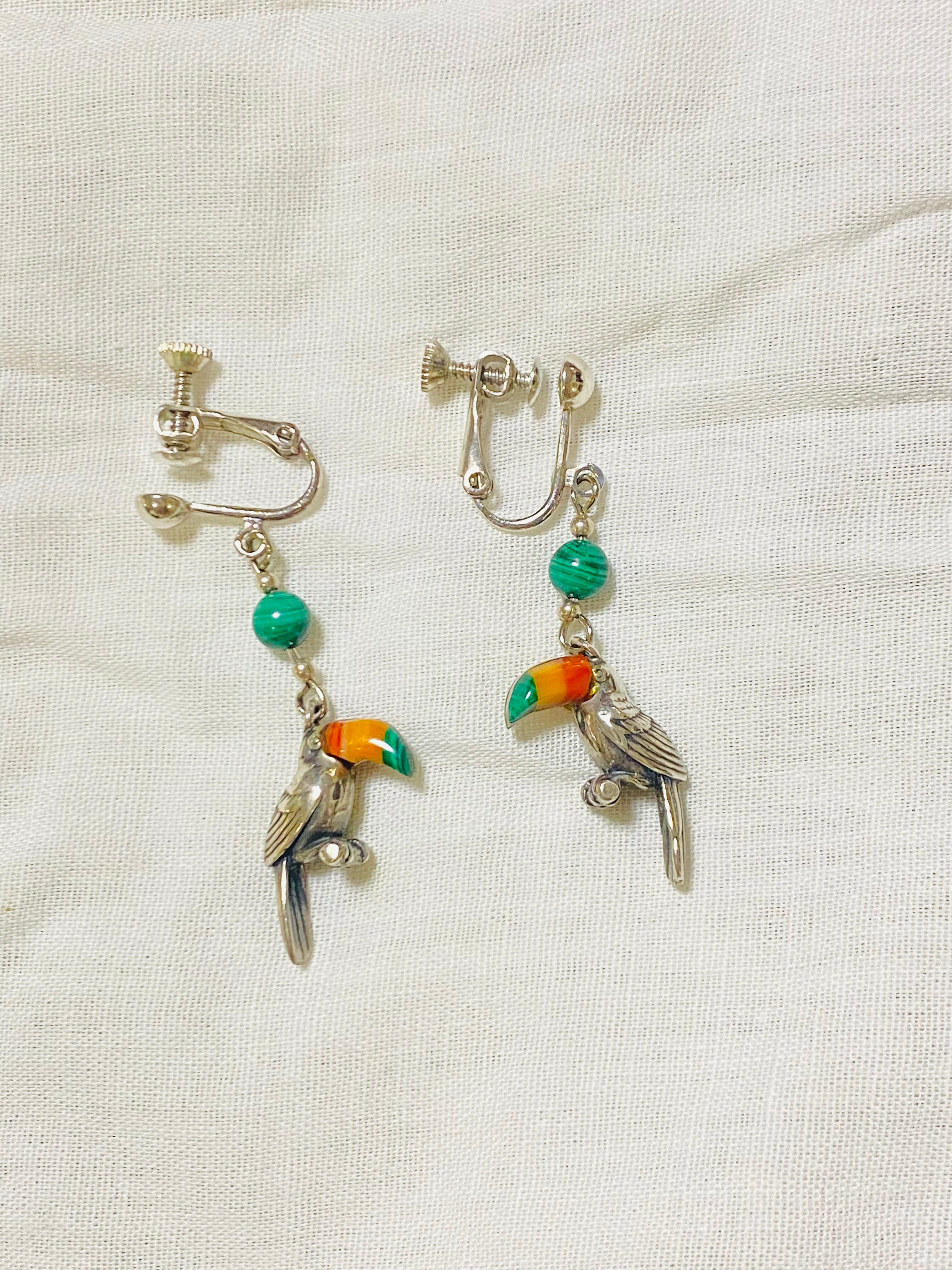 シルバー925 イヤリング ピアス 絶滅危惧種 parrot 半貴石瑪瑙他使用Made in U.S.A